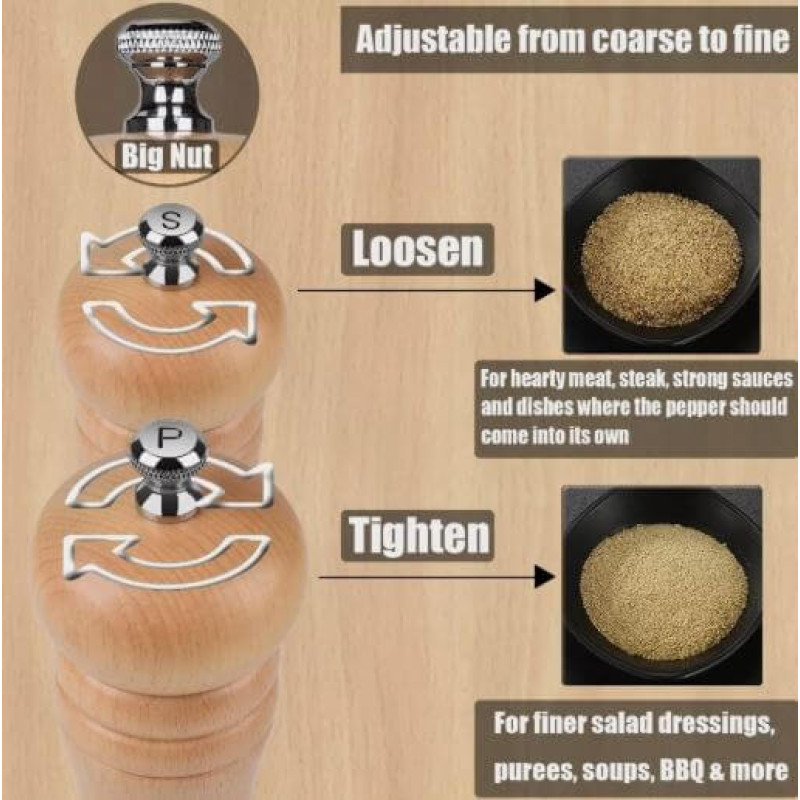 Standing at a large 10-inch size, each mill is designed for comfort and precision. The adjustable coarseness mechanism allows you to customise your grind—from fine dusting to coarse flakes—so every meal is perfectly seasoned to your taste.