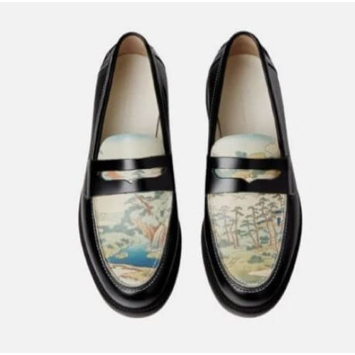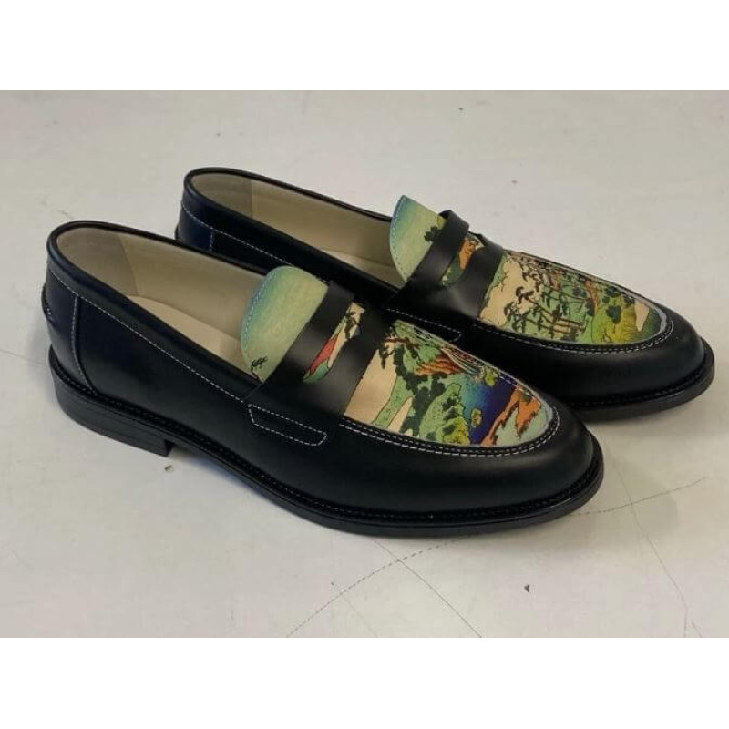 Step into art, culture, and craftsmanship with the Wilde Penny Loafers, inspired by Katsushika Hokusai’s “Eight Views of the Ryūkū Islands” series. Featuring a stunning digitally printed design of “Sacred Spring” across the vamp, these loafers combine traditional artistry with contemporary style.